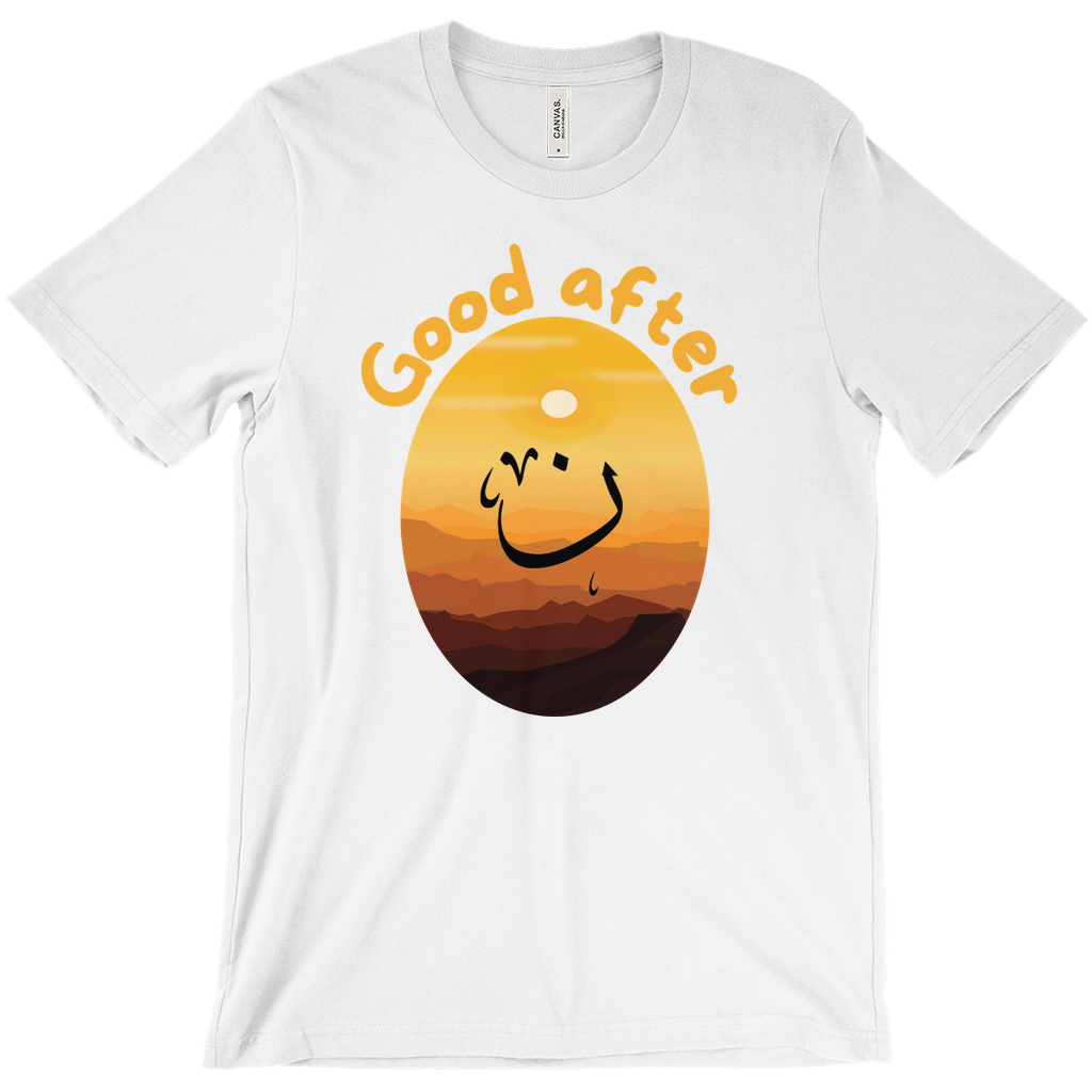 Brighten your day with this playful design that combines English and Arabic in a fun and creative way! Featuring the phrase “Good After” with a bold Arabic “ن” at its heart, this artwork is set against a stunning sunset-inspired backdrop.