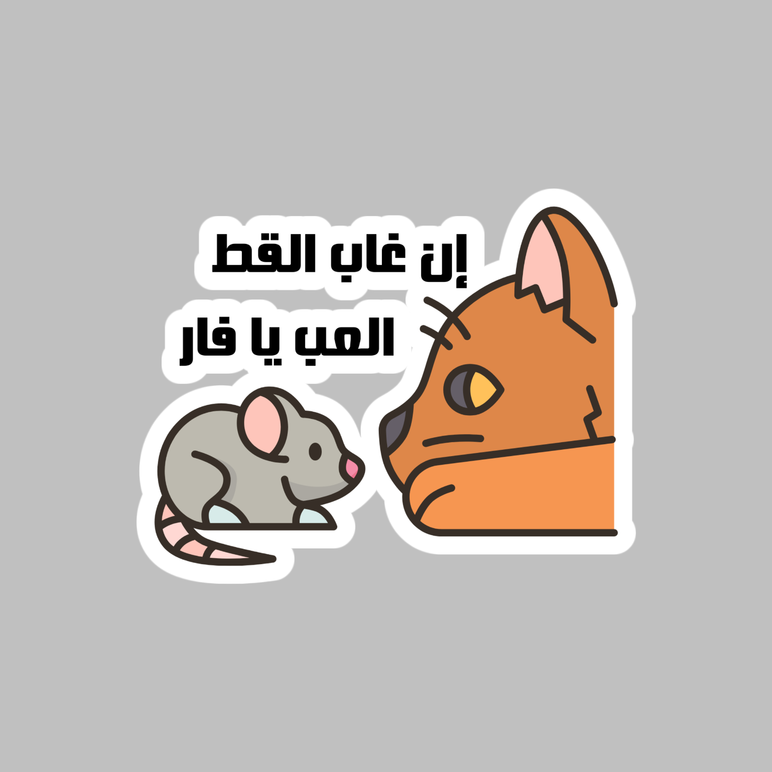 This playful sticker features the Arabic proverb: “إن غاب القط العب يا فار” (“If the cat’s away, the mouse will play”). Illustrated with a watchful cat and a cheeky mouse, this design is perfect for adding humor and cultural charm to your everyday items. A fun way to remind yourself of those mischievous moments!