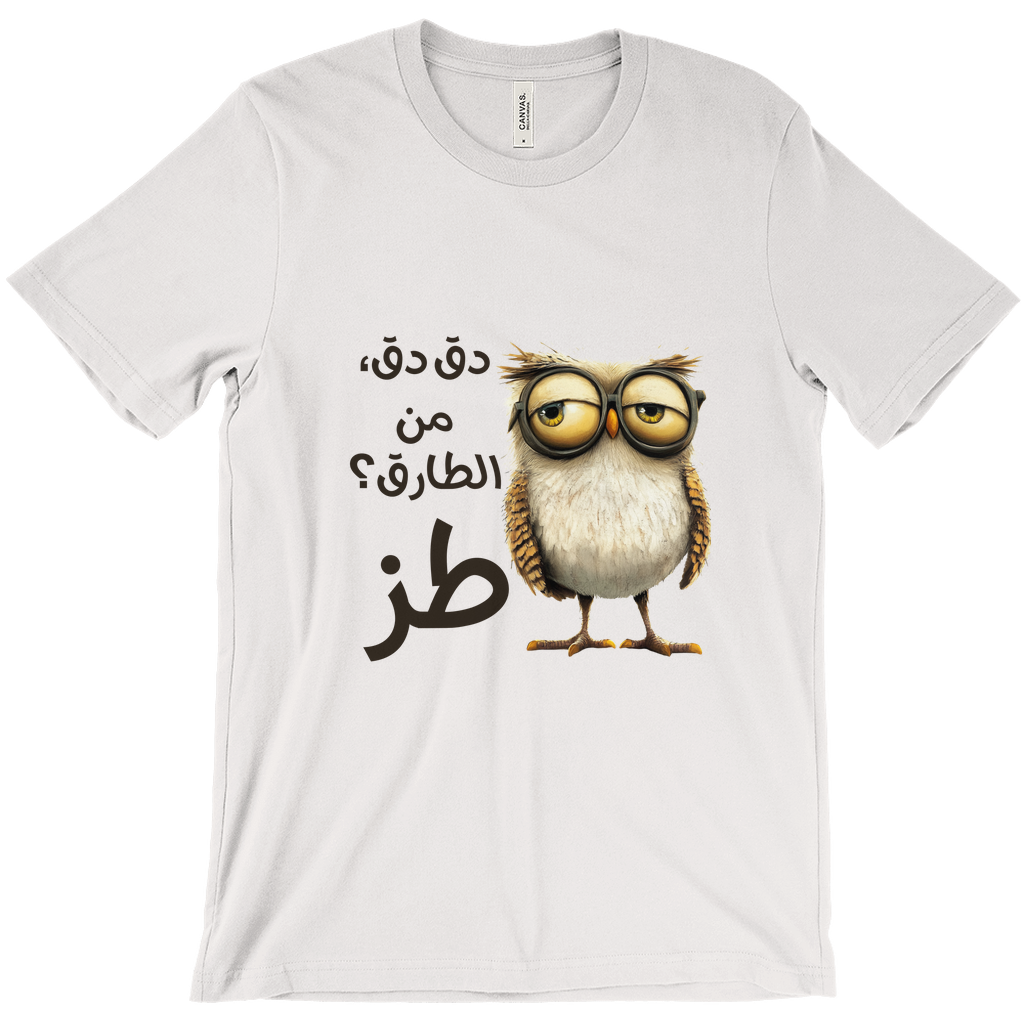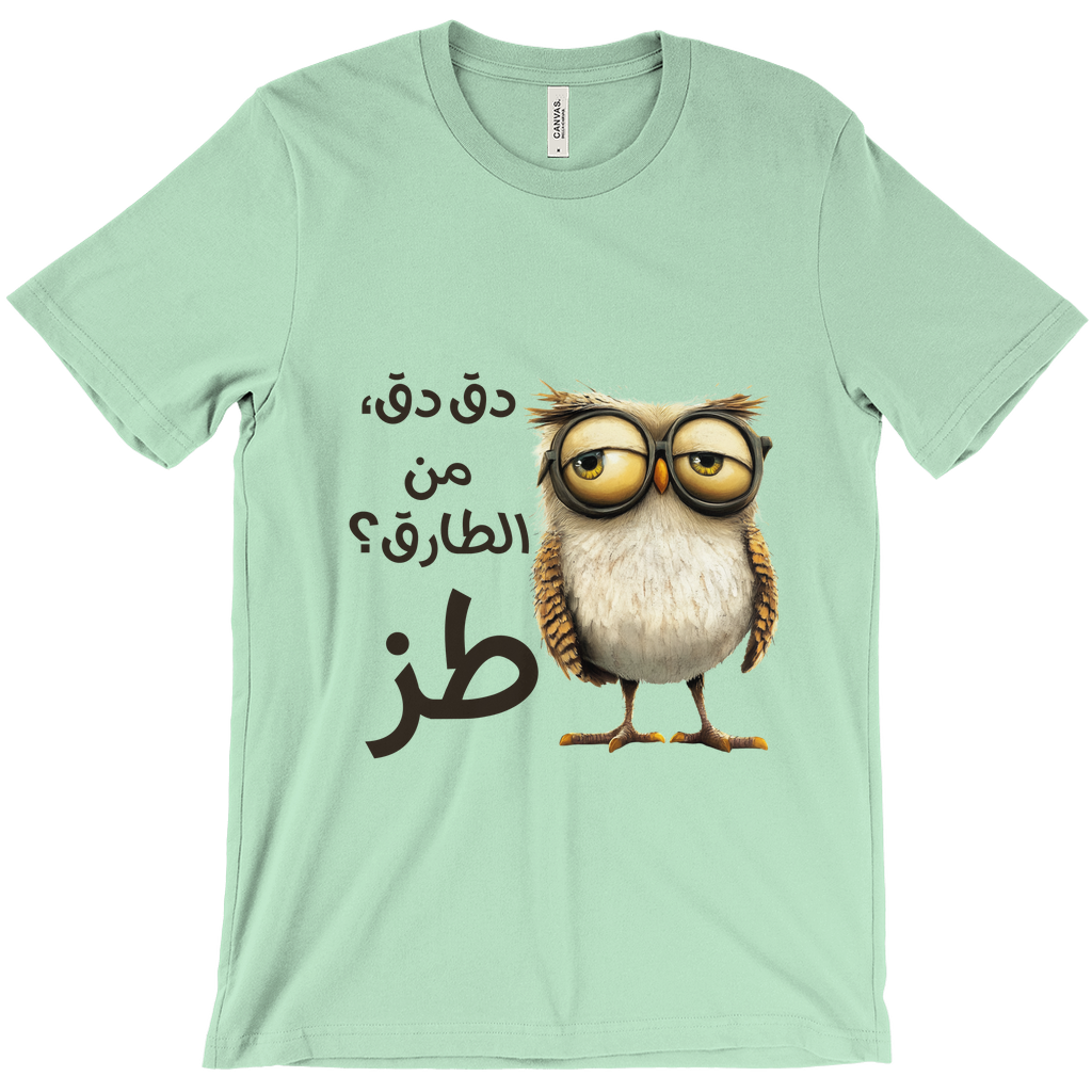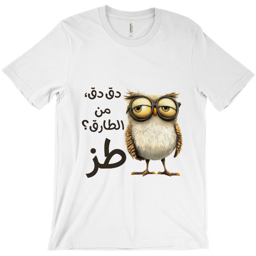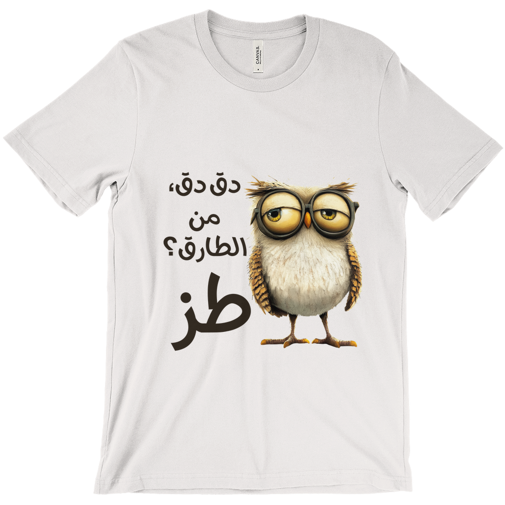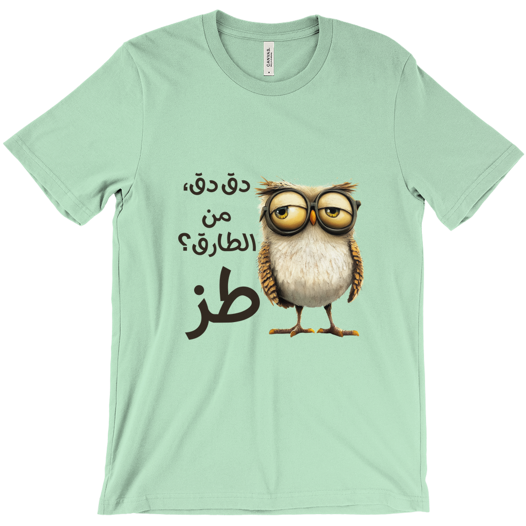 This hilarious design features a tired, sarcastic-looking owl with the phrase “دق دق، من الطارق؟ طز” (Knock knock, who’s there? Whatever). The combination of the grumpy owl and the sassy Arabic response creates a comedic and relatable vibe, perfect for those who love witty humor.