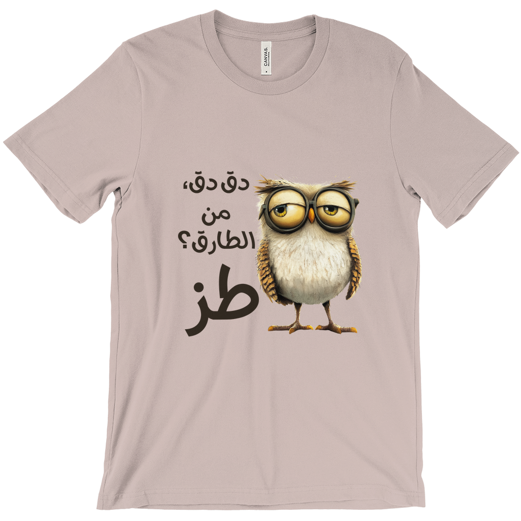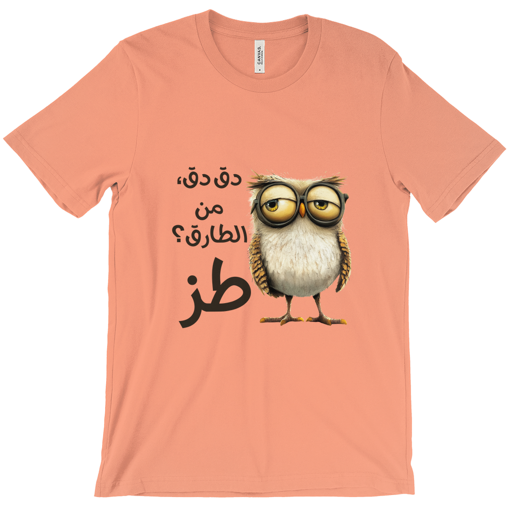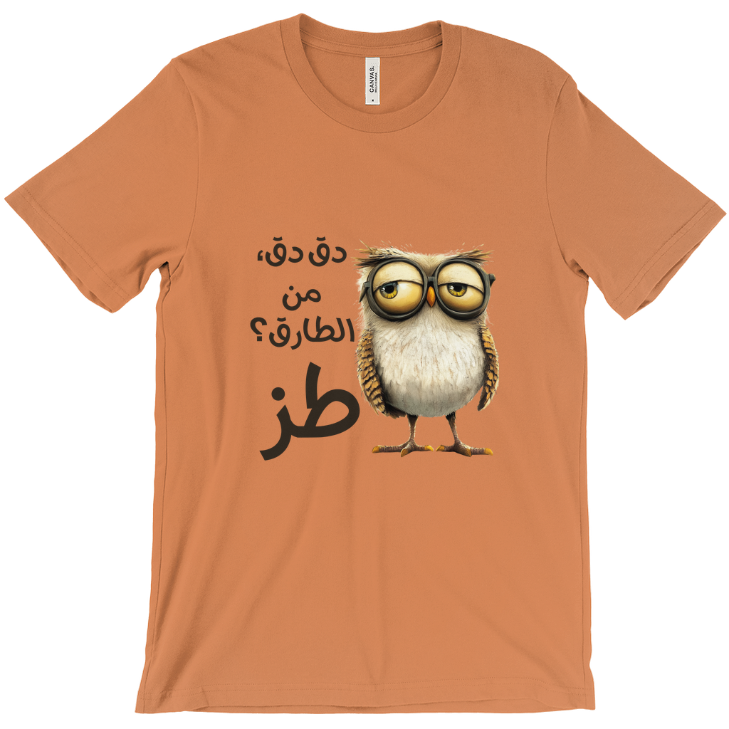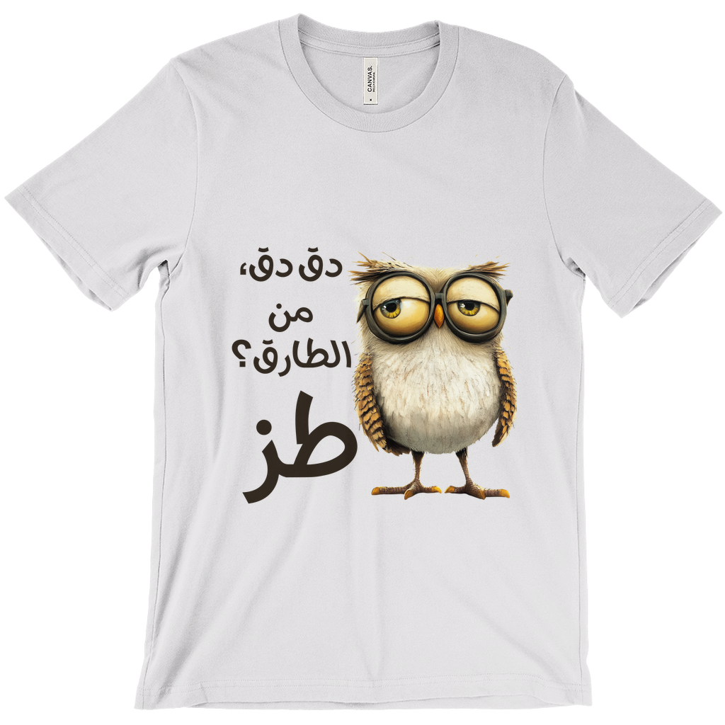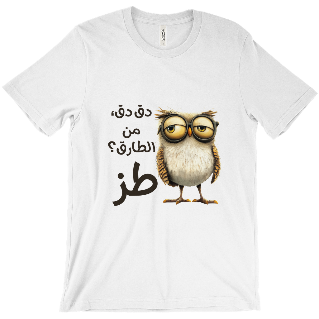 This hilarious design features a tired, sarcastic-looking owl with the phrase “دق دق، من الطارق؟ طز” (Knock knock, who’s there? Whatever). The combination of the grumpy owl and the sassy Arabic response creates a comedic and relatable vibe, perfect for those who love witty humor.