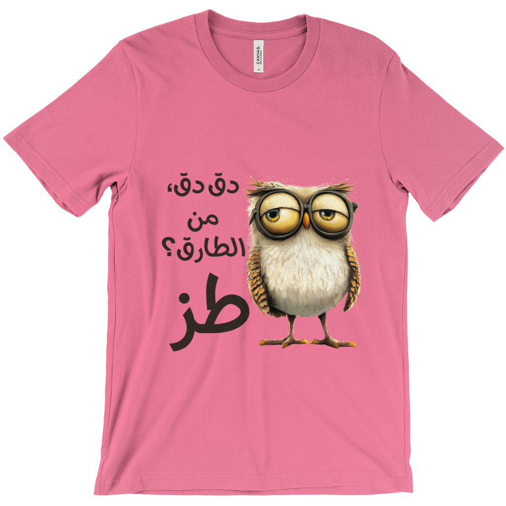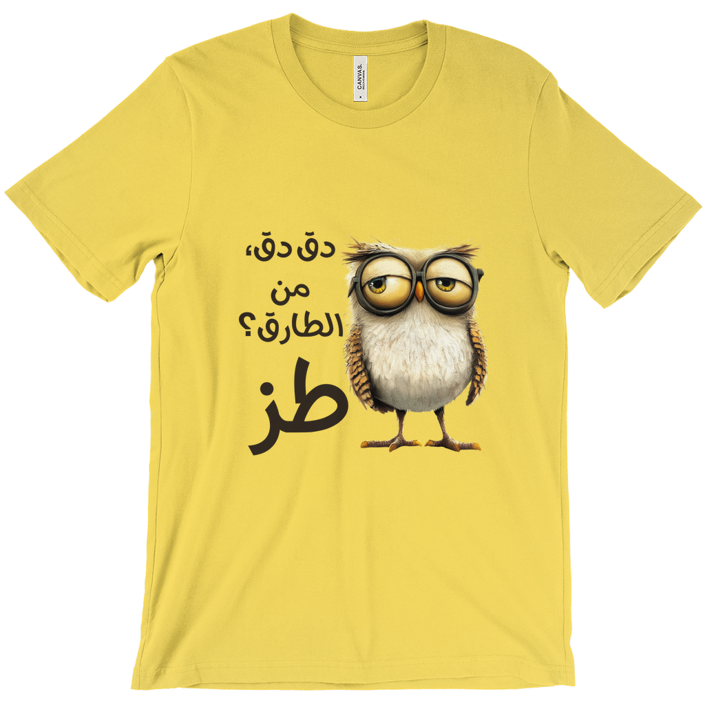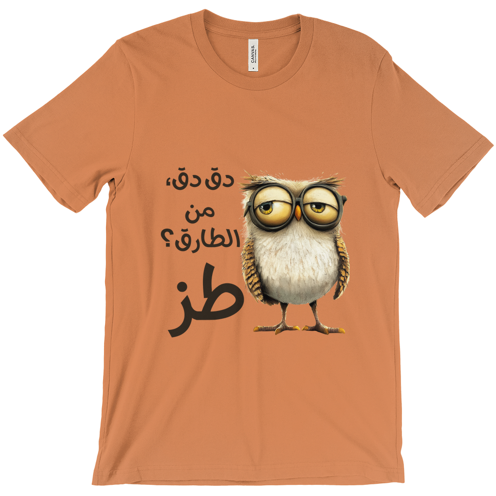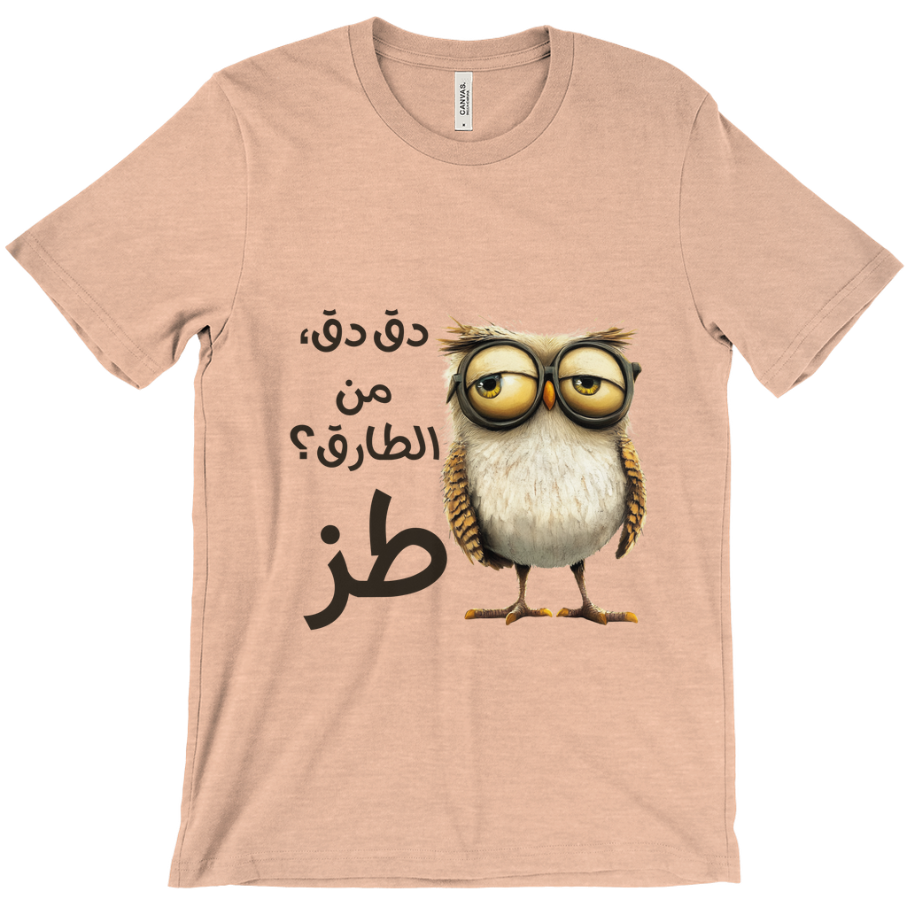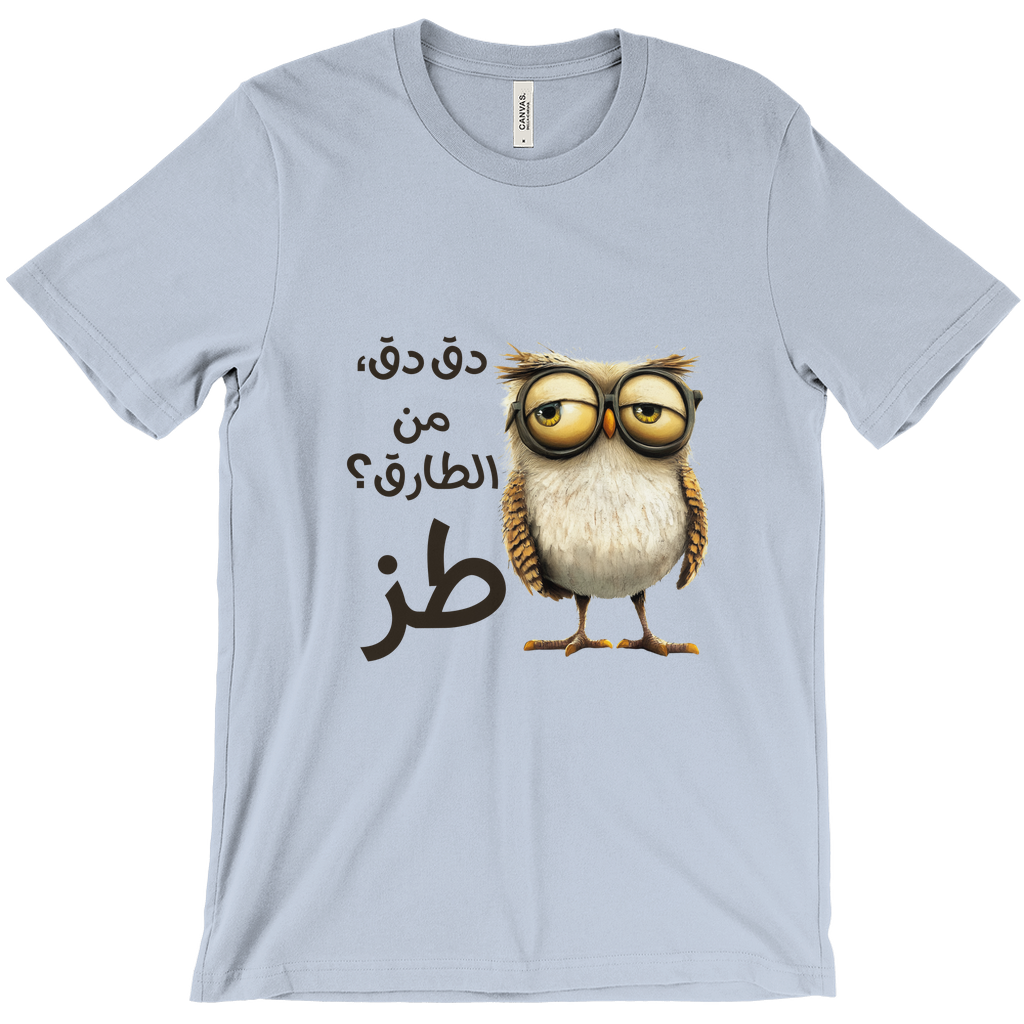 This hilarious design features a tired, sarcastic-looking owl with the phrase “دق دق، من الطارق؟ طز” (Knock knock, who’s there? Whatever). The combination of the grumpy owl and the sassy Arabic response creates a comedic and relatable vibe, perfect for those who love witty humor.