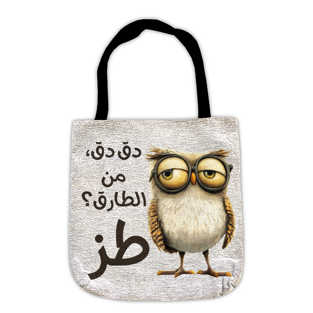 This hilarious design features a tired, sarcastic-looking owl with the phrase “دق دق، من الطارق؟ طز” (Knock knock, who’s there? Whatever). The combination of the grumpy owl and the sassy Arabic response creates a comedic and relatable vibe, perfect for those who love witty humor.