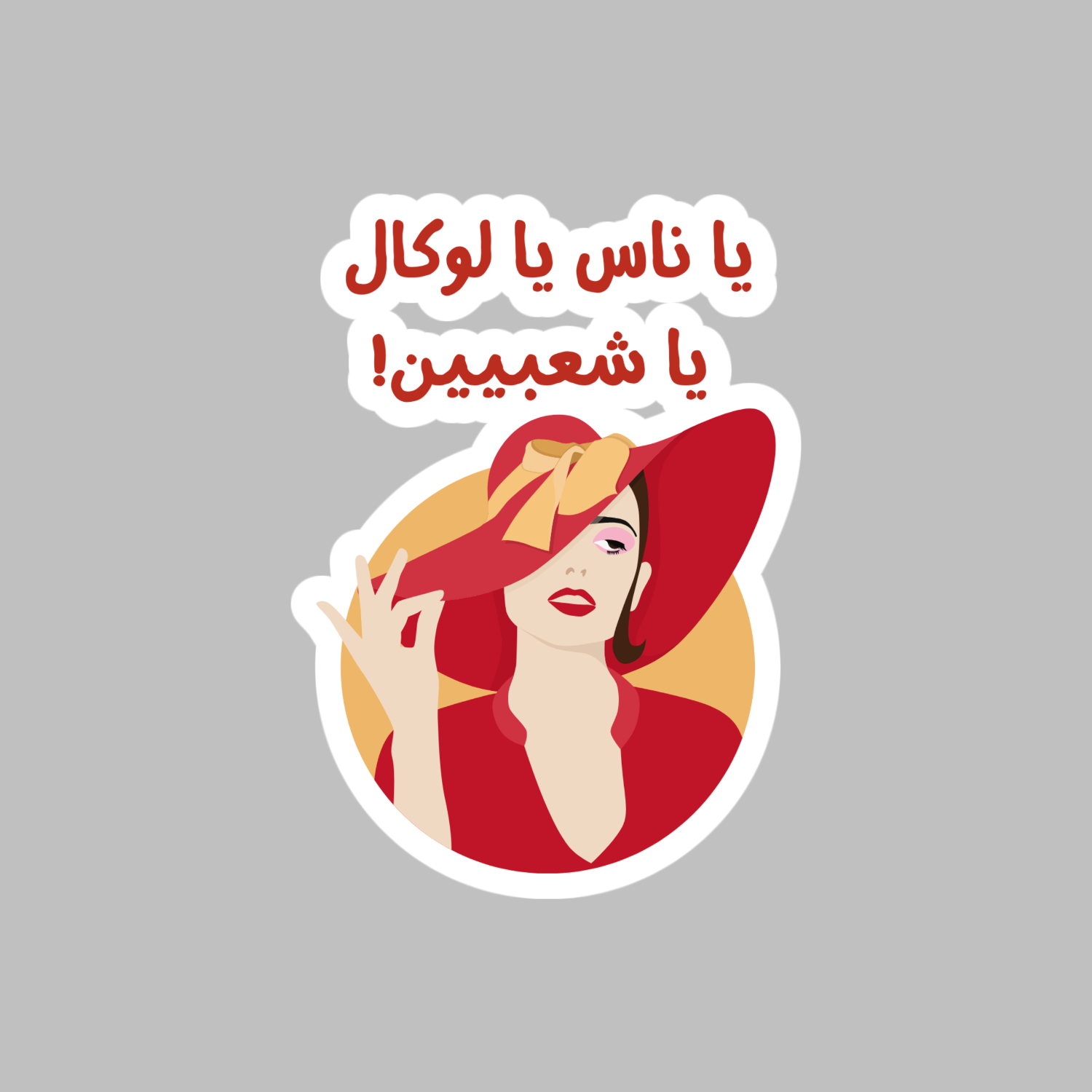 This fabulous sticker features the iconic phrase: “يا ناس يا لوكال يا شعبيين!” (“Oh people, you locals, you commoners!”) paired with a chic character in a glamorous hat. A playful nod to drama and flair, it’s perfect for those who love adding a touch of elegance and humor to their collection!