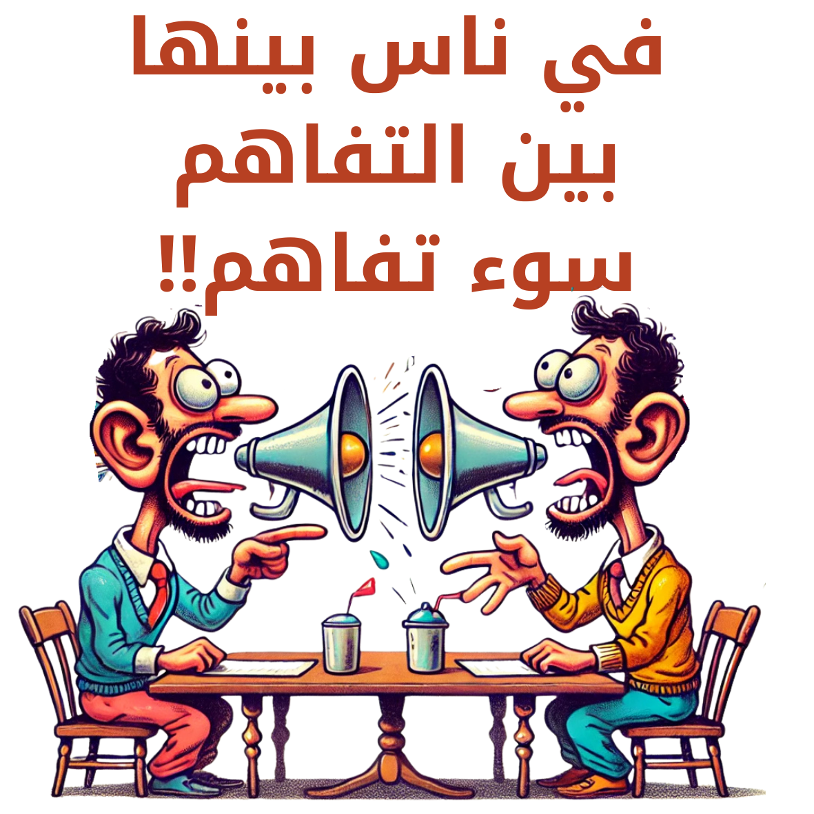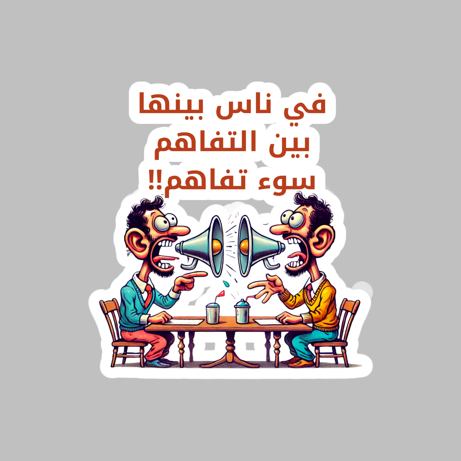 This humorous sticker highlights the phrase: “في ناس بينها بين التفاهم سوء تفاهم!!” (“Some people have a misunderstanding about understanding!”) Illustrated with two animated characters shouting through megaphones, it perfectly captures those chaotic conversations we all know too well. Add it to your collection for a relatable and funny twist!