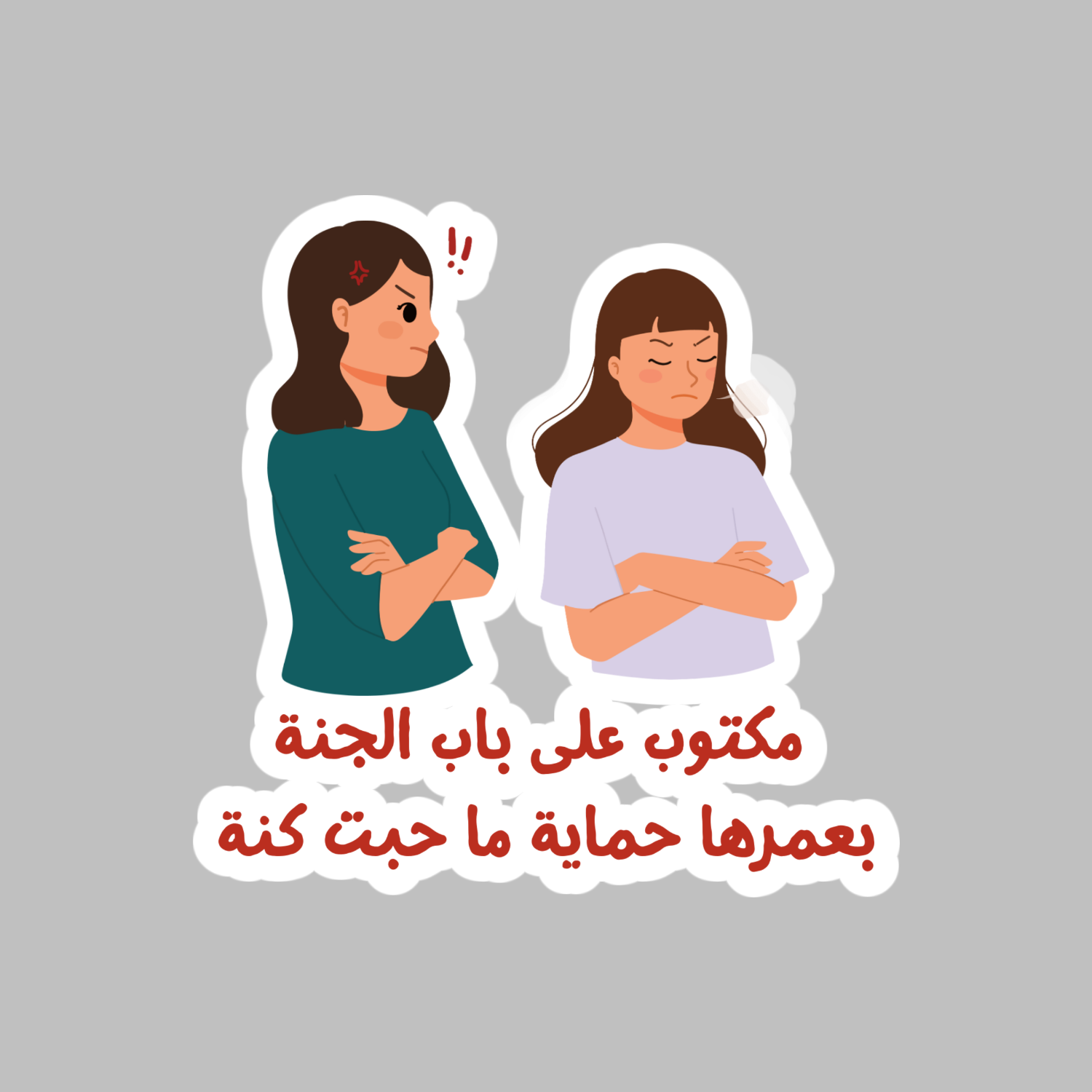 This hilarious sticker captures a timeless family dynamic with the phrase: “مكتوب على باب الجنة بعمرها حماية ما حبت كنة” (“Written on the gates of heaven: No mother-in-law ever liked her daughter-in-law”). Featuring two characters locked in a classic disagreement, this sticker is a lighthearted take on family relationships. Perfect for adding a touch of humor to your collection!