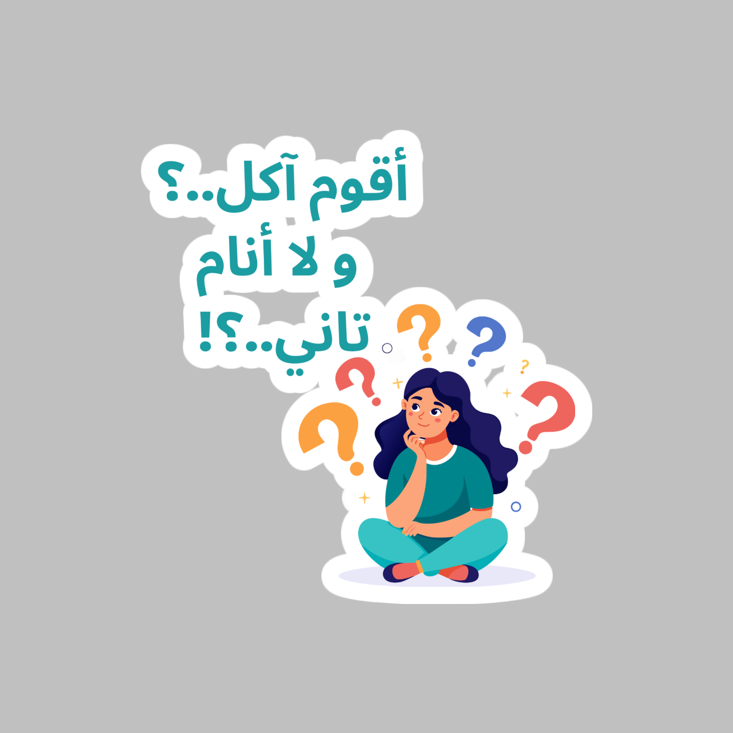 This funny sticker captures the eternal dilemma with the phrase: “أقوم آكل…؟ ولا أنام تاني…؟!” (“Should I get up to eat or just sleep again?!”). Featuring a confused character surrounded by question marks, it’s perfect for those indecisive, lazy moments. Add a humorous and relatable touch to your collection!